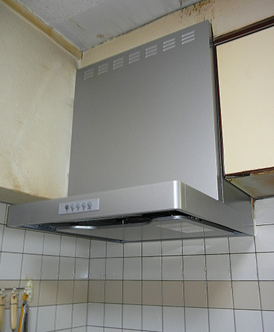 新しいレンジフードは奥様の手の届きやすい位置にスイッチが来るよう、レンジフードの縦の長さを既設よりも長いものにしました。